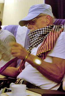 | Former British glam rocker Gary Glitter sits on a flight from Ho Chi Minh City to Bangkok after his release form his Vietnamese prison on Aug. 19. Mr. Glitter was freed from a Vietnamese prison after serving nearly three years for child sexual molestation. Photo: Aude Genet/AFP/Getty Images |