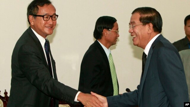 Cambodian Prime Minister Hun Sen, right, shakes hands with opposition leader Sam Rainsy before a meeting at the National Assembly in Phnom Penh, Cambodia, Sept. 17, 2013.