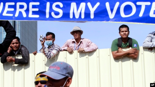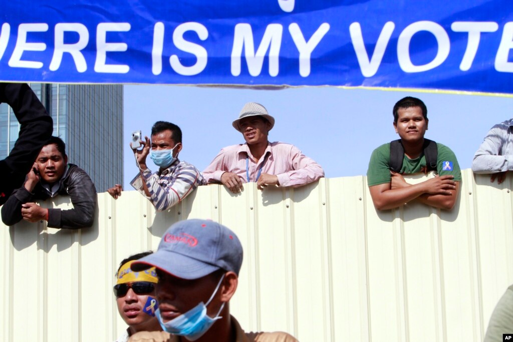 Cambodian workers look through a partition of a construction site below a banner which reads "Where is my vote" as supporters of opposition Cambodia National Rescue Party gather in Phnom Penh, file photo.