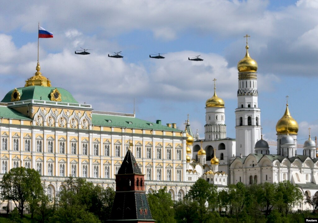 Russian military helicopters fly in formation with the Kremlin and the Ivan the Great Bell Tower seen in the foreground, in central Moscow May 3, 2014.