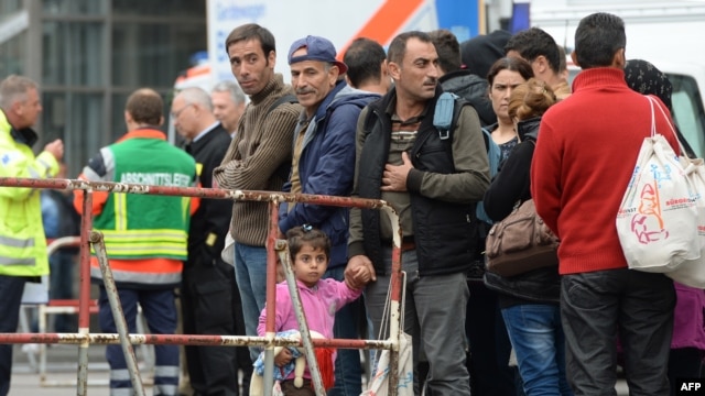 | ក្រុមជនអន្តោប្រវេសន៍រង់ចាំធ្វើការត្រួតពិនិត្យសុខភាពបន្ទាប់ពីបានមកដល់ស្ថានីយ៍រថភ្លើងនៅក្រុង Munich ភាគខាងត្បូងអាល្លឺម៉ង់នាថ្ងៃទី០៥ ខែកញ្ញា ឆ្នាំ២០១៥។ |