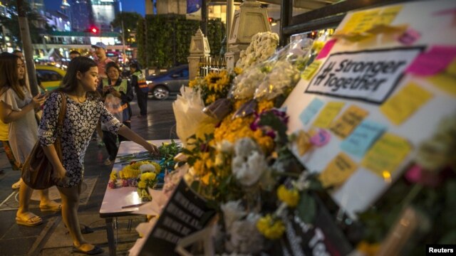 | ស្រ្តីម្នាក់ដាក់ផ្កានៅទីសក្ការៈ Erawan ទីដែលមានការបំផ្ទុះគ្រាប់បែកកាលពីខែសីហា នៅកណ្តាលទីក្រុងបាងកក។ |