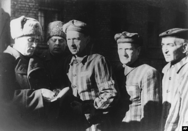 | FILE- In this file photo dated January 1945, three Auschwitz prisoners, right, talk with Soviet soldiers after the Nazi concentration camp Auschwitz, in Poland, was liberated by the Russians. |